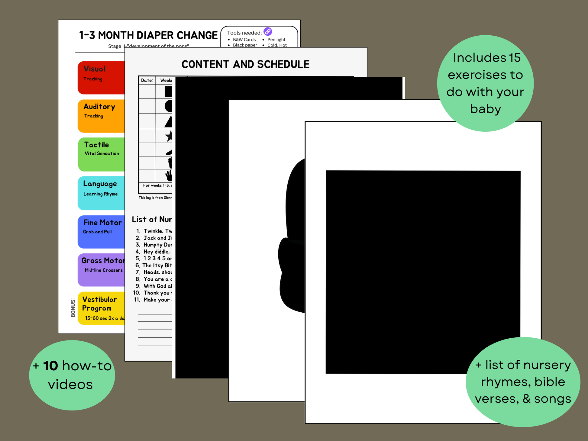 The innovative solution that transforms diaper-changing moments into engaging and developmental experiences for your little one. Based on many Doman principles, from the book "Fit baby, Smart baby, Your baby", we have designed these progressive brain building routines with both convenience and child development in mind. This kit takes the ordinary task of changing diapers and turns it into a fun and interactive bonding and brain building time.